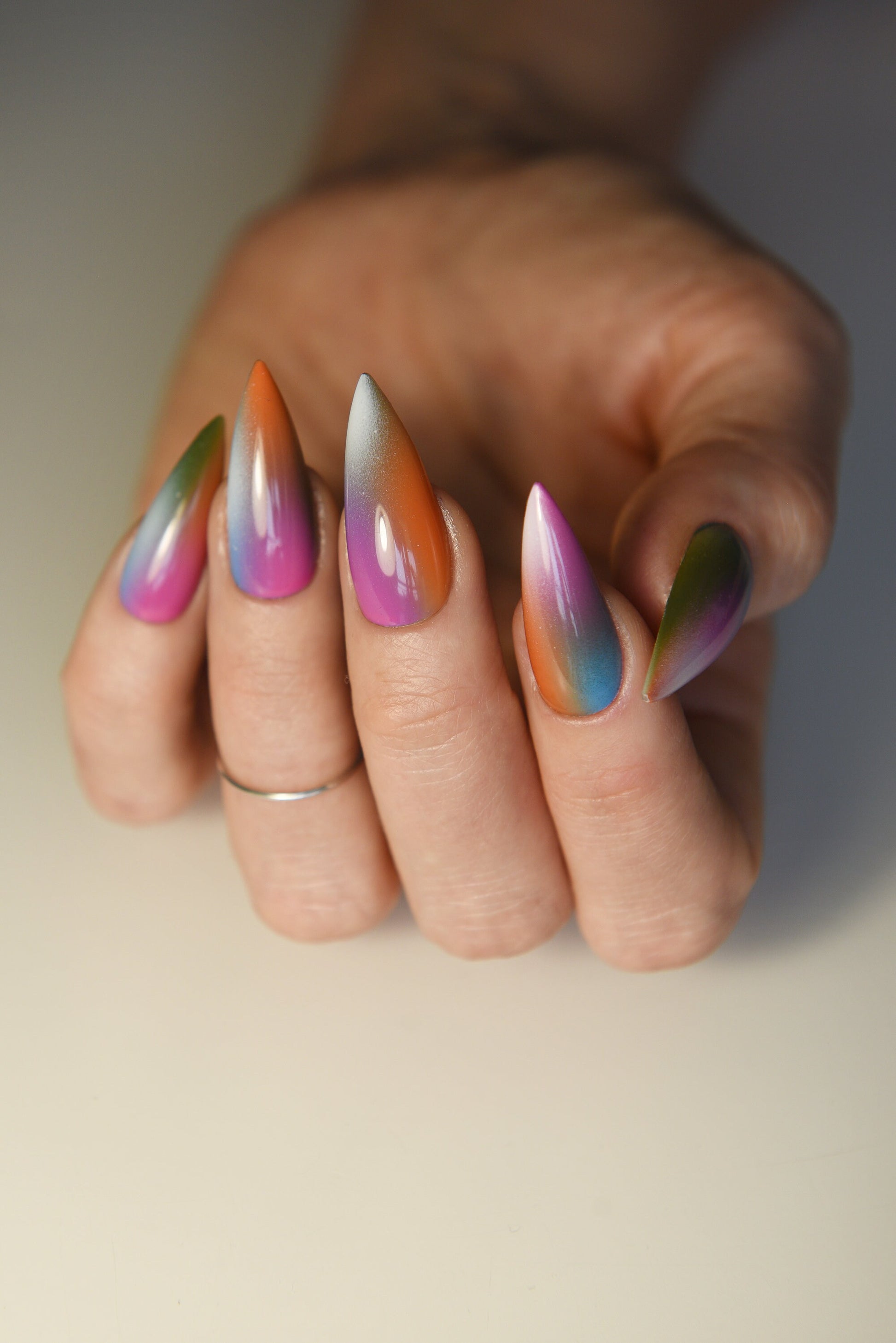 Our luxury press-on nails are handmade with care, giving you flawless, colorful nails in minutes. The Aura Stains set features dreamy, blended colors inspired by spring and blush tones—perfect for a soft, unique manicure.