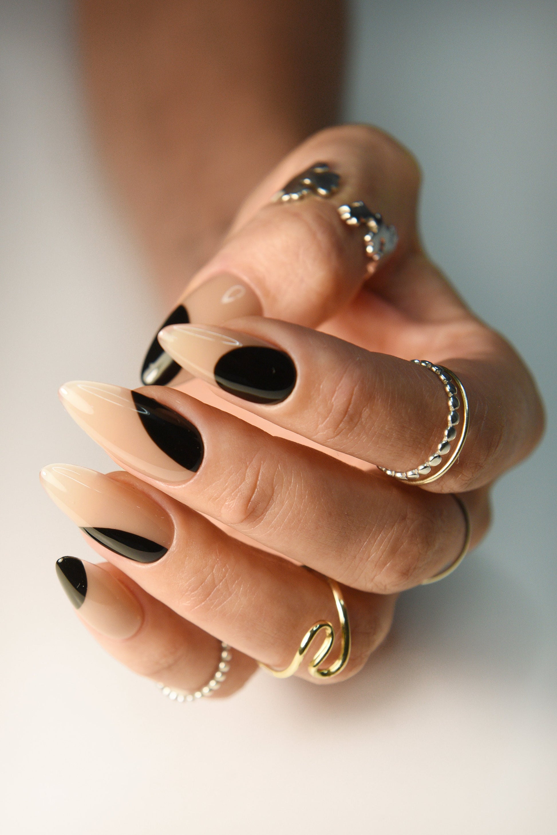 Minimalist beige base with black geometric spot art – the perfect blend of modern, clean girl aesthetic and subtle edge. Choose from long, medium, or short in your favorite shape for an instant style upgrade.