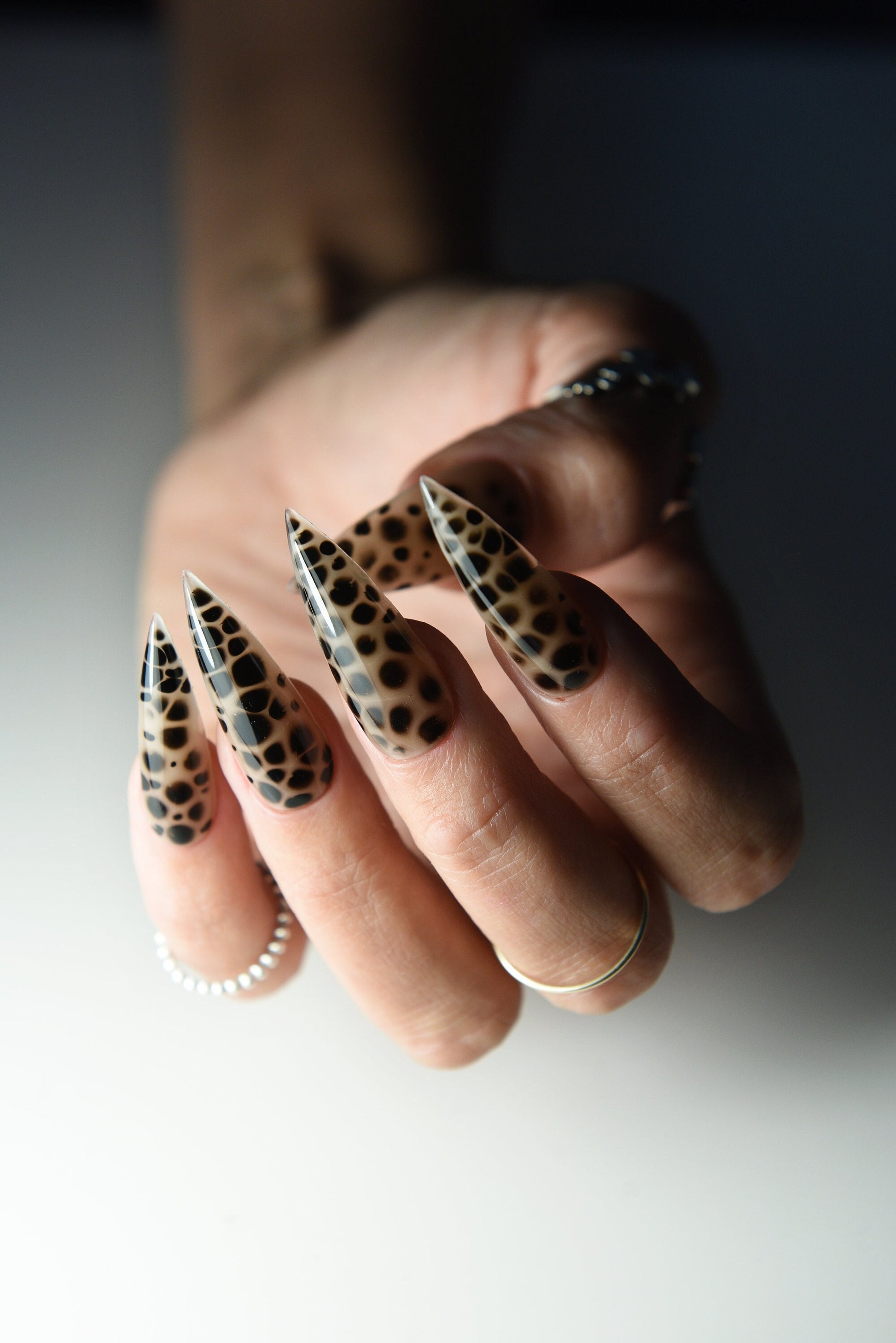 Unleash your wild side with our Goth Cheetah Nude Black Stains Press On Nails. Each set is handmade and features unique leopard dot details in a dramatic nude and black colorway for a witchy, alternative look. Enjoy flawless nails in minutes—no salon needed.