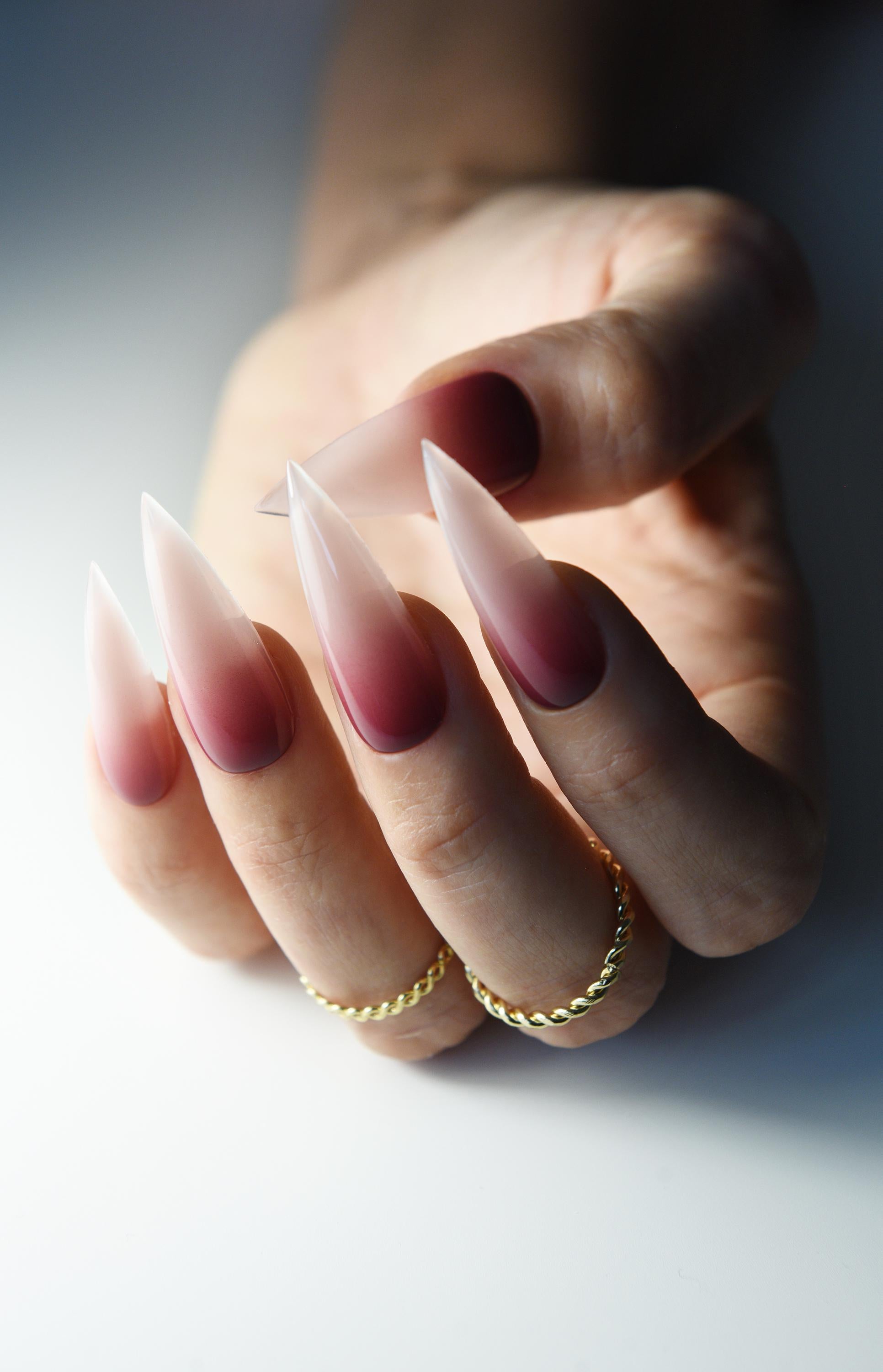 Striking red-to-nude ombre for a gothic girl vibe. Choose your ideal shape (stiletto, almond, square, coffin, oval, or ballerina) and length (long, medium, or short). Each set is painted by hand for a unique finish.