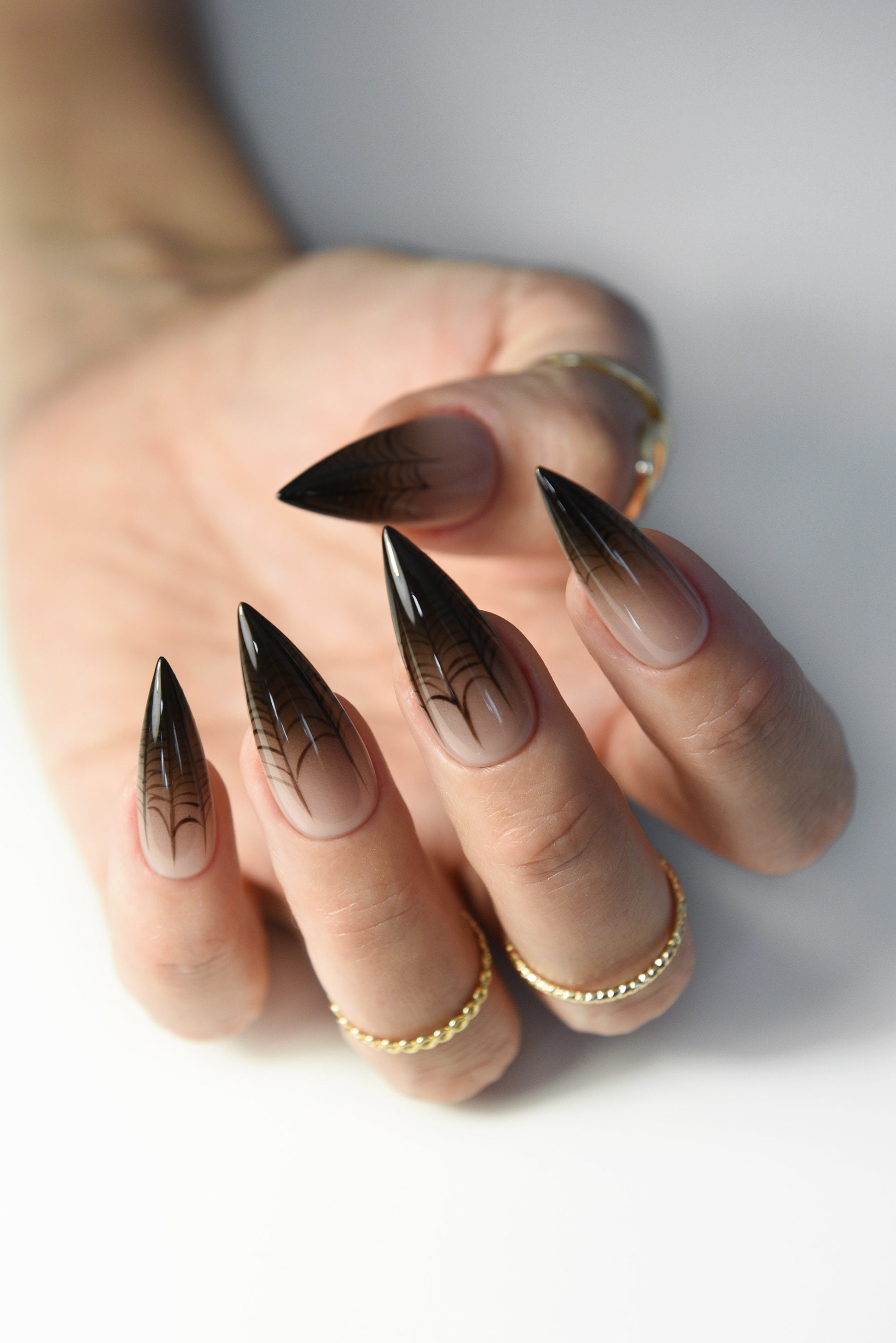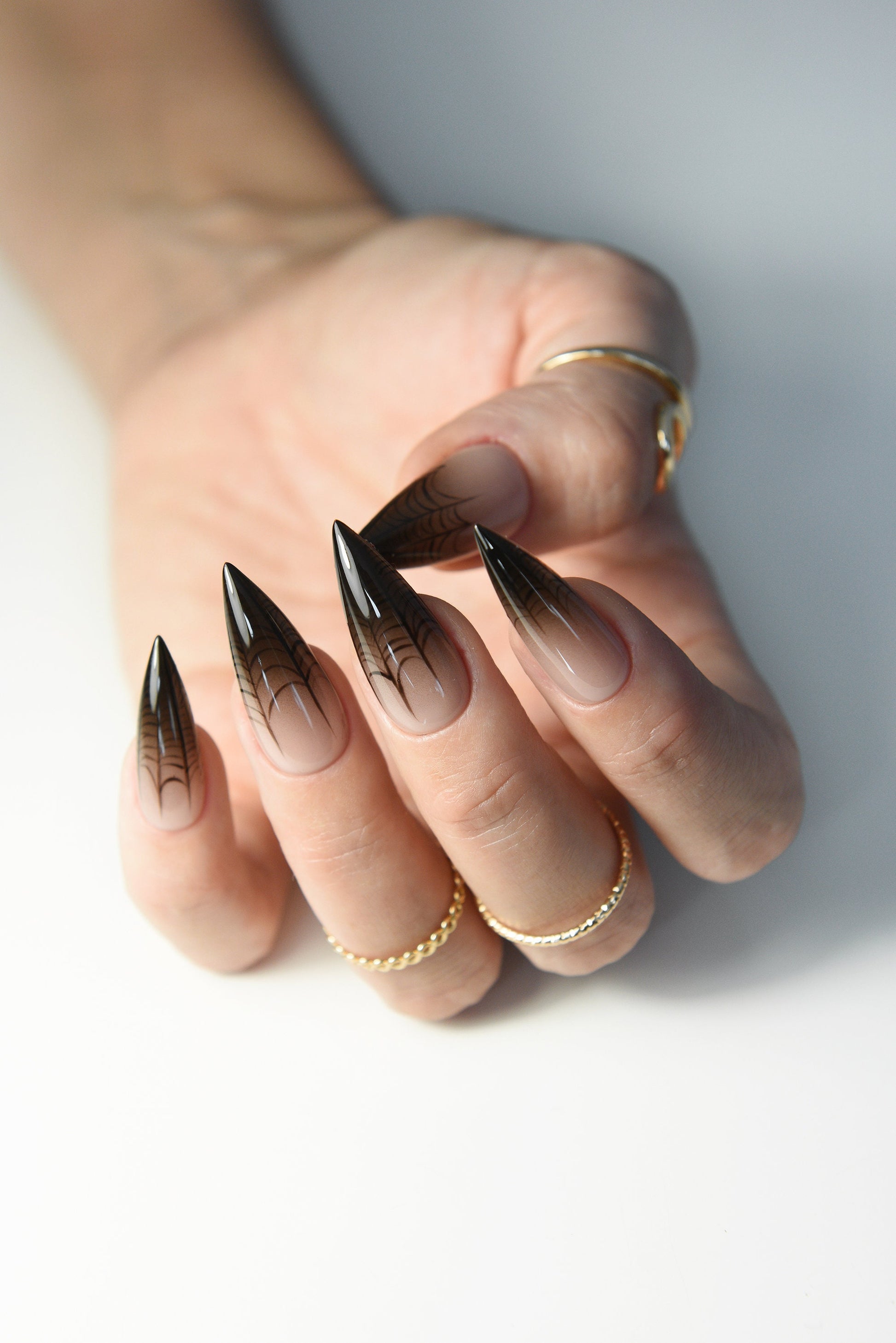 Halloween Spiderweb Press-On Nails – Nude Ombre Stiletto, Spooky Handmade & Reusable