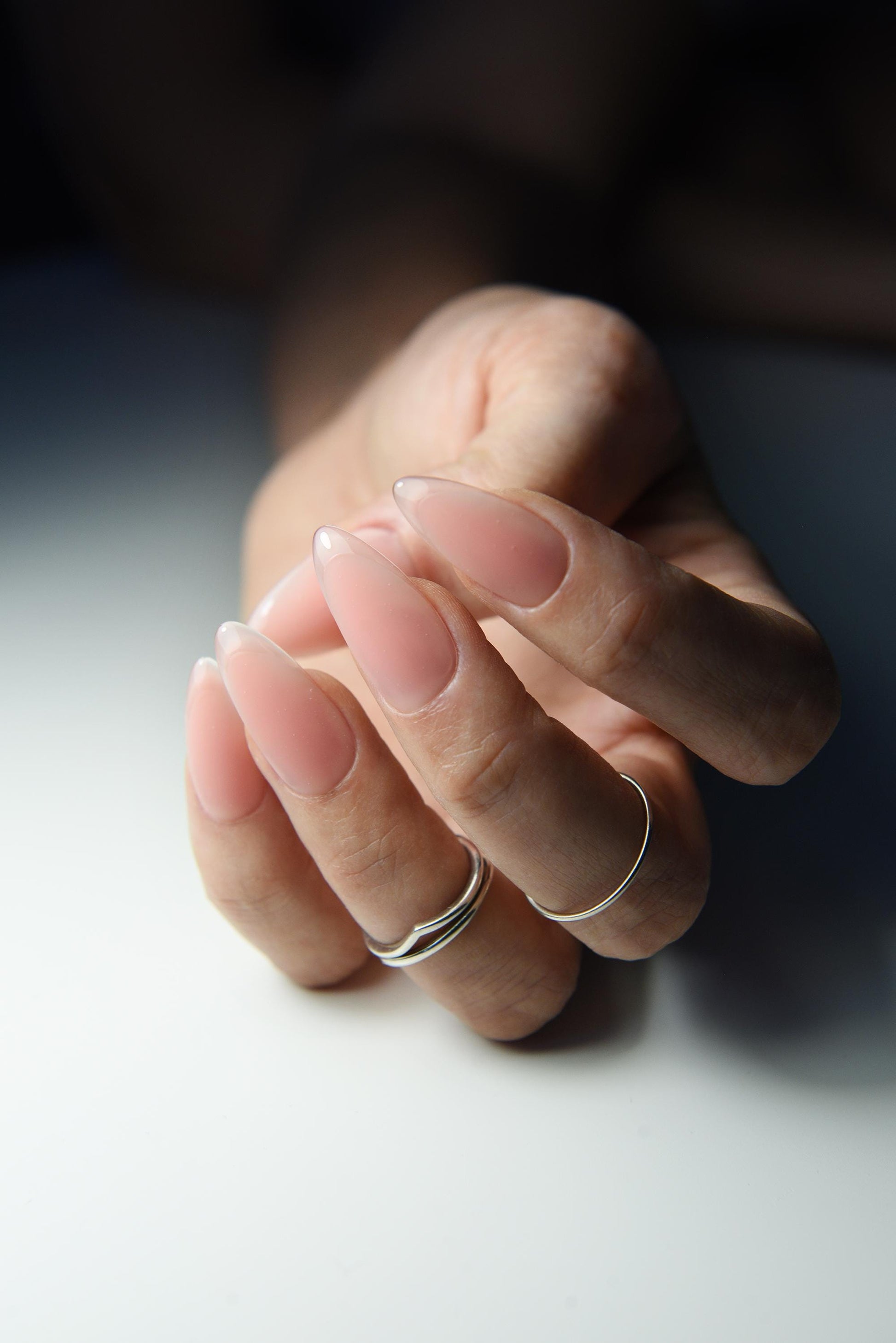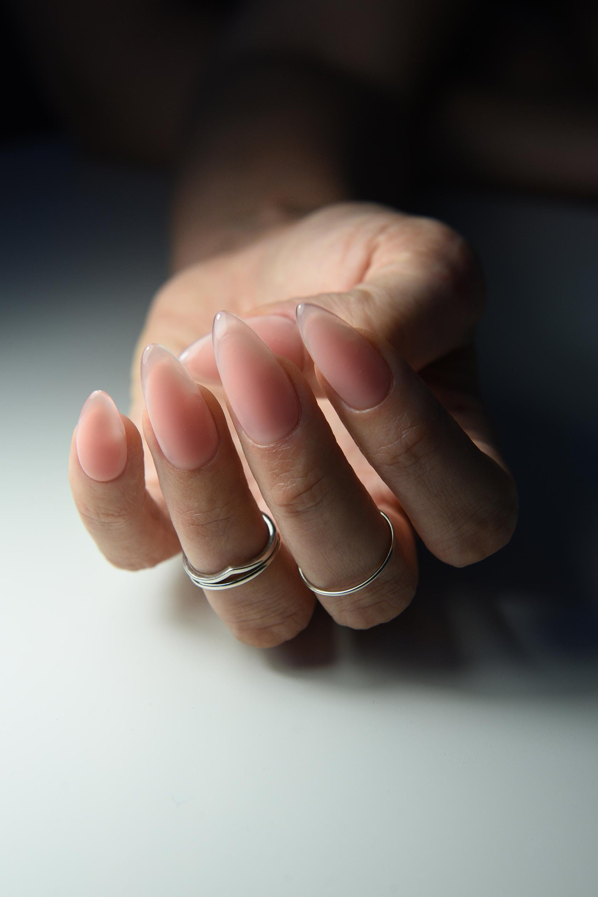 Jelly Rose translucent pink matte nails, finished with a high-gloss French tip. Elegant, feminine, and on trend for the season. Available in long stiletto, short square, wide, or any custom shape and length you prefer.