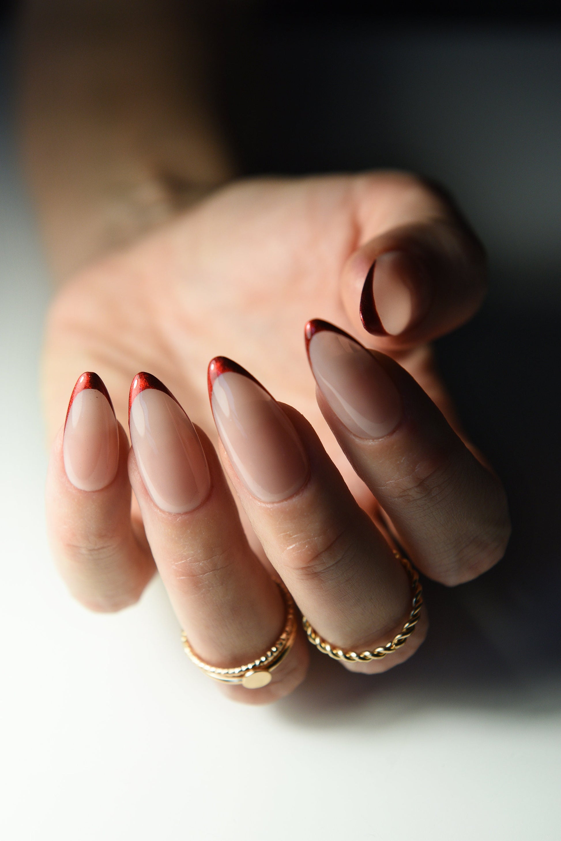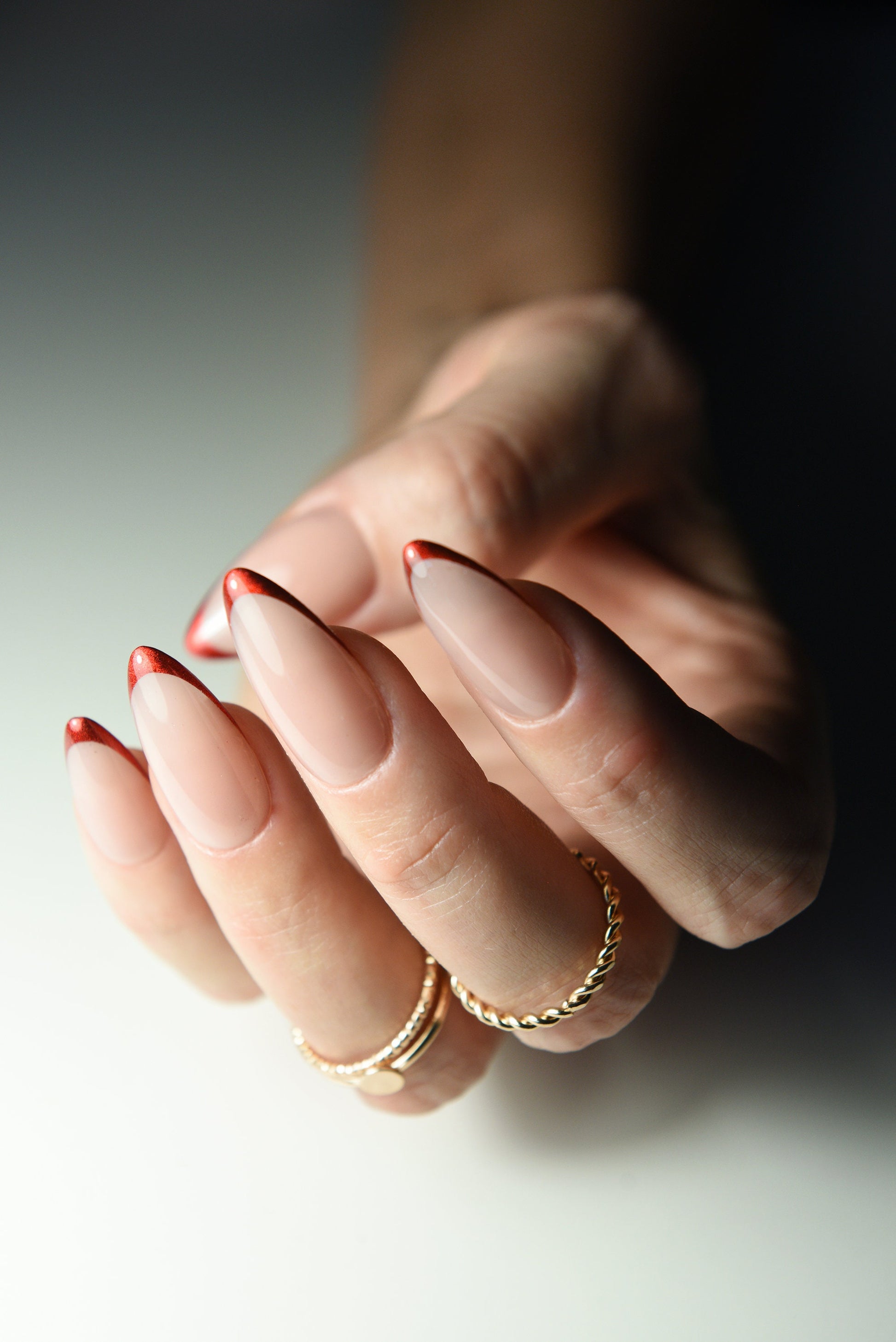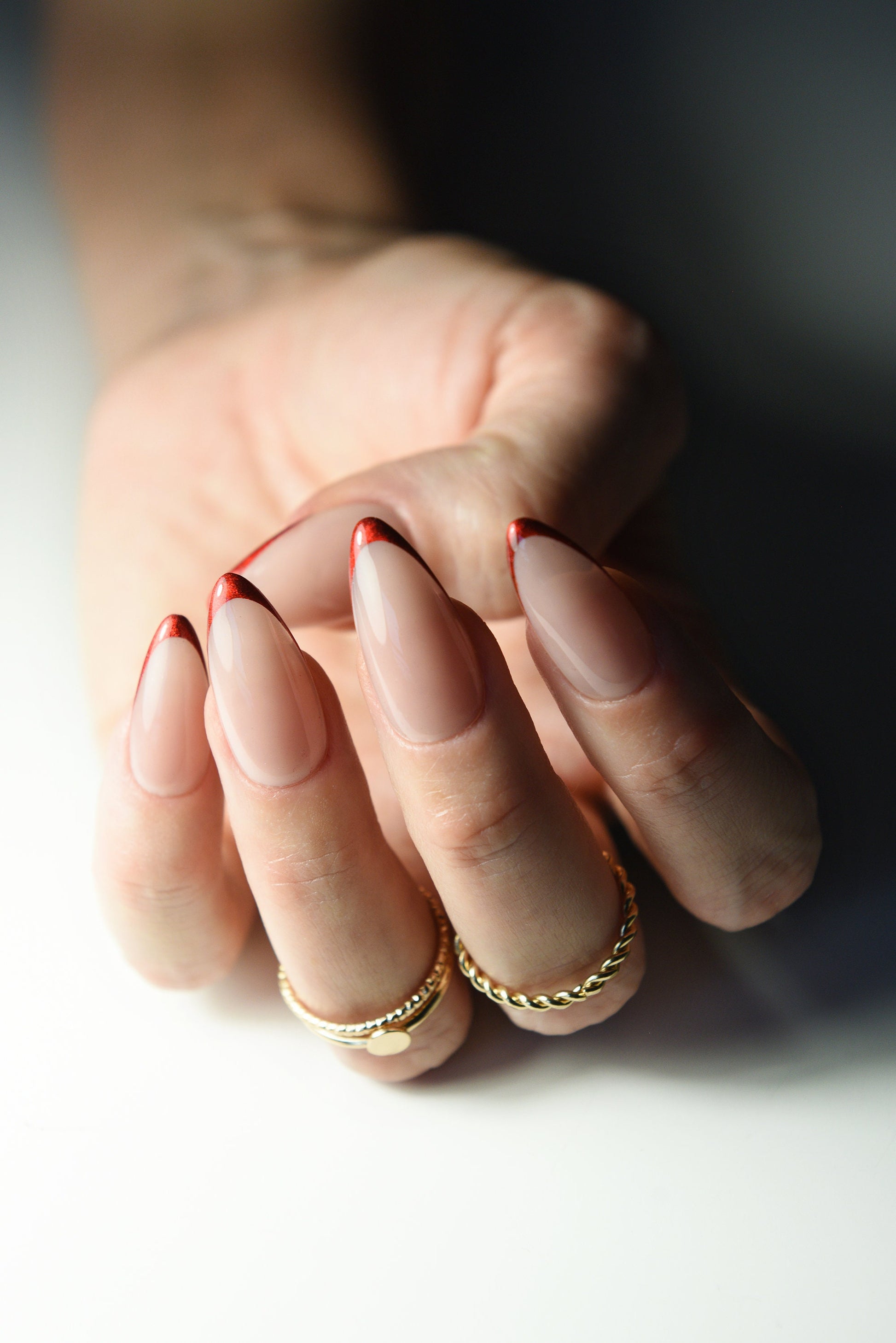 Our luxury press-on nails are handmade with care, giving you flawless nails in minutes. This set features a classic nude base with festive red glitter French tips—perfect for the holiday season, Christmas parties, winter dates, or as a special gift.