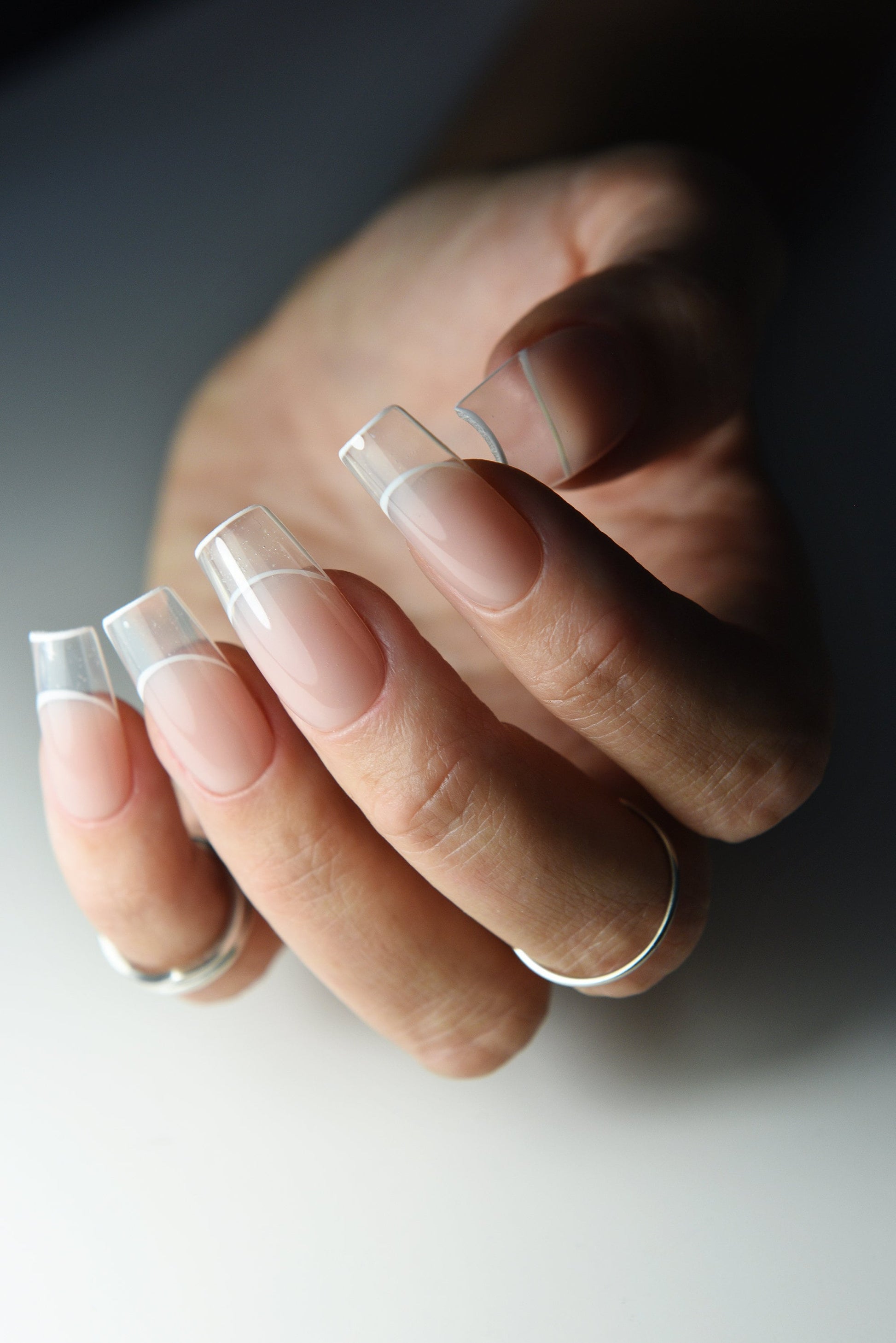 Royal Glass French – a translucent, soft French tip effect that elevates any look. Choose your ideal shape (almond, square, stiletto, oval, coffin, or ballerina) and length (long or short). Each set is handmade for a natural, elegant appearance.