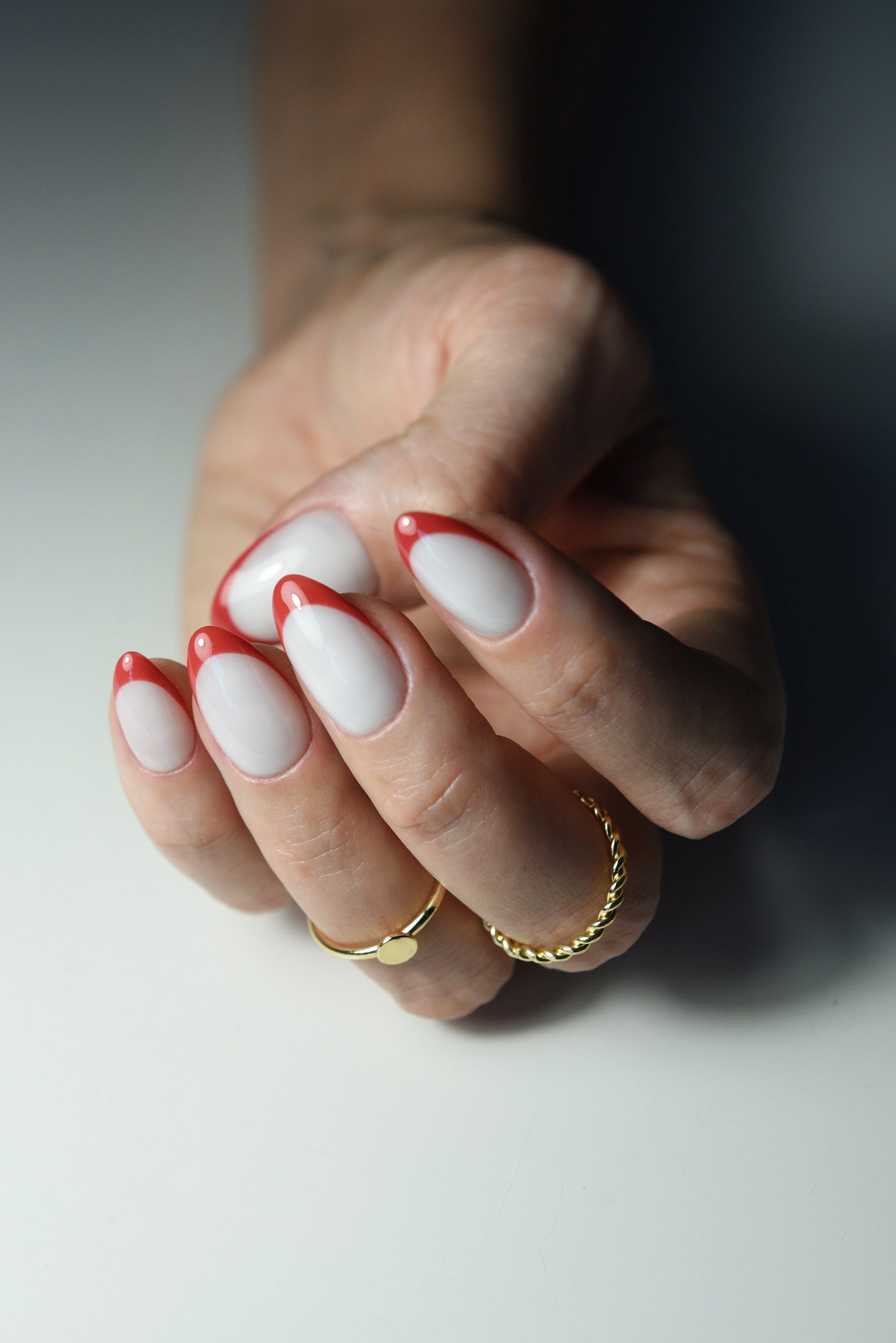 White & Red French Press-On Nails – Romantic Handmade Nail Set